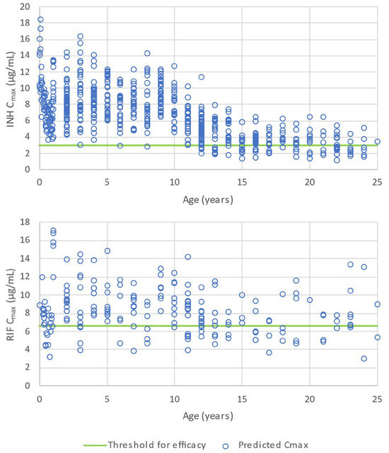 Cmax predicted for populations of pediatric subjects for INH (upper panel) and RIF (lower panel) by age group according to the dosing schedule of Table 1. The horizontal line shows the minimum threshold for efficacy according to Kiser et al. [57] for INH (upper panel) and Pasipanodya et al. [68] for RIF (lower panel).