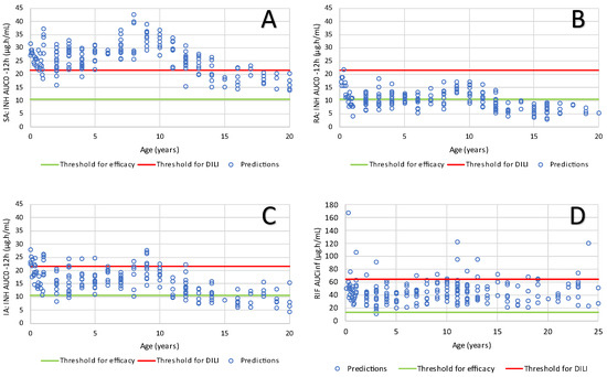 AUC predictions for pediatric populations of INH SA (A), INH RA (B), INH IA (C), and RIF (D) according to the schedule of Table 1. The horizontal lines show the minimum AUC for efficacy and maximum adult AUC for INH DILI according to Zheng et al. [69]. The horizontal green line for panel (D) shows the threshold for efficacy according to [68].