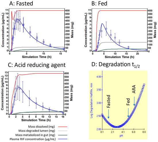The impact of altered gastric emptying due to the type of formulation (dispersible or coated tablet) was assayed through the conduct of population cross-over simulations. The average gastric emptying for the dispersible tablet was set to 0.1 h, which is typical of that for a suspension in GastroPlus (default), whereas the gastric emptying for the whole tablet was set to 0.5 h on average, which would be representative of delayed emptying, due to more prolonged in vivo disintegration of the tablet. The dissolution was governed by the extreme Z-factors calculated on the dispersible or whole tablets. Indeed, formulations displaying the biggest difference in terms of Z-factor, namely, dispersible tablet batch 2111EX054 (INH Z-factor = 4.5 × 10−5 mL/mg/s) and tablet batch NRT9104 RIF Z-factor = 2.3 × 10−3 mL/mg/s), were used as the fasted batches, whereas the coated batch 09060664 (INH Z-factor = 1.13 × 10−5 mL/mg/s) and coated batch A9362 (RIF Z-factor = 6.63 × 10−4 mL/mg/s) were used as the slowest dissolving batches. Cross-over simulations were conducted in adults in the fasted state at a 300 mg dose for INH and 600 mg dose for RIF.