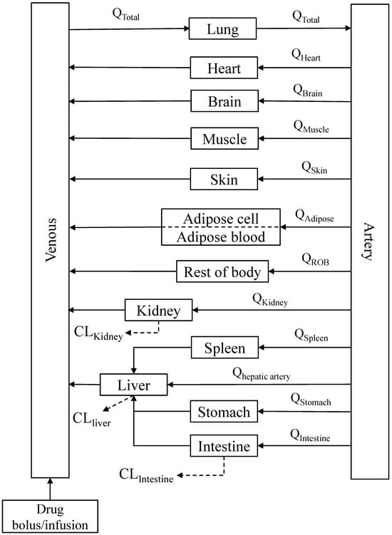 A PBPK model (Figure 1) was constructed to describe the pharmacokinetic profiles of SPT-07A in rats, dogs, and humans. The essential structure of the model consisted of the lung, heart, brain, muscle, skin, adipose, kidney, liver, spleen, stomach, intestine, arterial, venous blood, and the rest of the body. All tissues except for the adipose are represented by a perfusion-rate limited model. SPT-07A was eliminated in the liver, kidney, and intestine. The differential equations are described as follows [30,31]:
