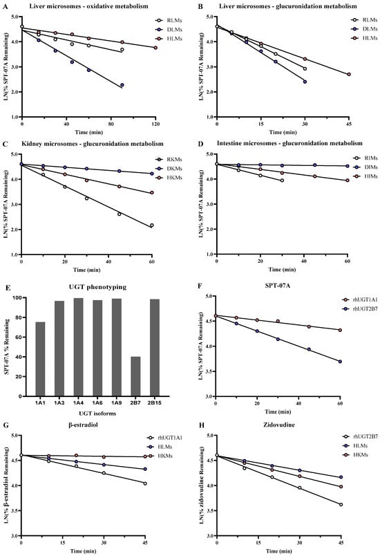 The analytical standard of SPT-07A was supplied by Suzhou Pharmavan Co., Ltd. (Suzhou, China). Camphorquinone, β-estradiol, zidovudine, and Uridine 5′-diphosphoglucuronic acid (UDPGA) were purchased from Sigma-Aldrich (Saint Louis, MO, USA). Alamethicin was provided by Shanghai Aladdin Biochemical Technology Co., Ltd. (Shanghai, China). NADPH tetrasodium salt was from Roche (Mannheim, Germany). Bovine serum albumin (BSA) and magnesium chloride hexahydrate (MgCl2·6H2O) were obtained from Sinopharm Chemical Reagent Co., (Shanghai, China). Mixed-gender rat liver microsomes (RLMs), dog liver microsomes (DLMs), human liver microsomes (HLMs), rat intestine microsomes (RIMs), dog intestine microsomes (DIMs), human intestine microsomes (HIMs), and human kidney microsomes (HKMs) were obtained from Xenotech (Kansas City, KS, USA). Rat kidney microsomes (RKMs) and dog kidney microsomes (DKMs) were acquired from IPHASE (Beijing, China). Recombinant UGT enzymes were purchased from Xenotech (Kansas City, KS, USA). All the other reagents were of analytical grade and commercially available.