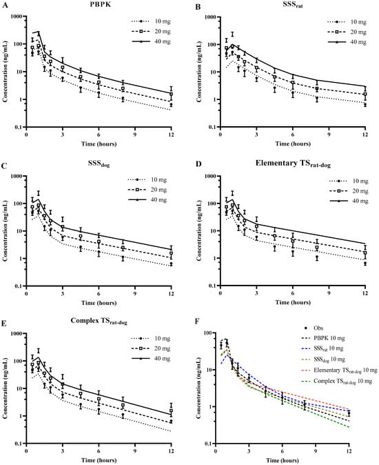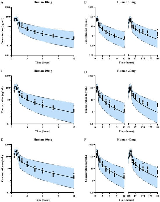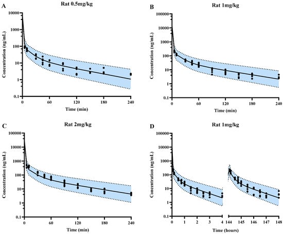 The plasma concentrations of STP-07A following intravenous dose to 100 virtual animals and humans were predicted on the Phoenix WinNonlin software (Version 8.3, Certara, USA, Inc., Princeton, NJ, USA) using the parameters listed in Table 1 and Table 2. The simulations were further compared with observations.