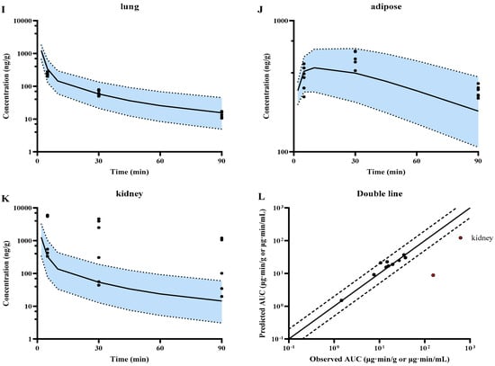 where subscripts adi, 1 and 2 represent the adipose tissue, vascular and extravascular compartments, respectively. The values of and are derived from an open-source PK-Sim software (version 11.2). Specifically, for rats, they are 2.66 mL and 16.34 mL; for dogs, 210 mL and 1290 mL; for humans, 1800 mL and 8200 mL. PS is the permeability-surface product, which was estimated by fitting this value to the adipose concentration data in rats. The values of PS in other species were estimated by Equation (13).
