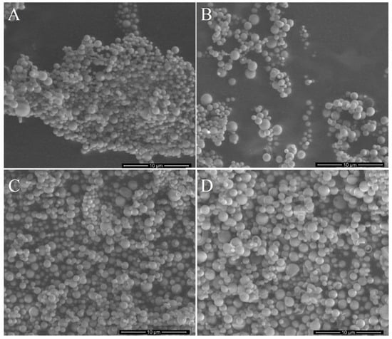 SEM images of nanospheres loaded with 3a (A), 3b (B), 3c (C) and 3d (D).