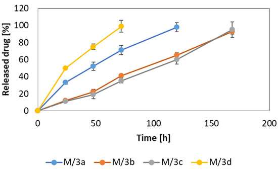 Drug release was studied in an in vitro environment. The drug release from NS was very insignificant and below detection even after 30 days of incubation. The release process from micellar formulations proceeded much faster, as presented in Figure 3, because after 24 h, 50% of the drug was released from M/3d and 33% from M/3a. The release of drug was completed after 72 h from M/3d and after 120 h from M/3a. The slowest release was observed for M/3b and M/3c, because it was extended to 168 h. No significant differences in drug release were observed between M/3b and M/3c; however, differences were observed in other samples. Additionally, significant differences were observed between M/3a and M/3d. The differences in the rate of release of particular phenothiazine derivatives may suggest the influence of the type of substituent in the 9, 10 and 11 positions of the quino[3,4-b][1,4]benzothiazine scaffold. The derivative with OH groups in the quinobenzothiazinium system (3d) showed the most rapid drug release.