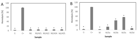 In the next step, the hemolytic effect was evaluated for NS and M, which also influences their pharmaceutical potential. Determination of hemolytic properties in vitro is a common and important method for the preliminary evaluation of the cytotoxicity of various materials, chemicals, drugs or any blood-contacting medical devices []. As presented in Figure 4, all types of NS, including both the drug-loaded and drug-free formulations, did not show any hemolytic effect (Figure 4A). On contrast, differences were observed in the effect of micelles on the erythrocytes (Figure 4B). Drug-free micelles (M) showed an effect similar to the negative control (C−). The M/3a and M/3d caused a very insignificant hemolytic effect. Significantly increased hemolysis was observed for M/3b and M/3c. Apparently, the hemolytic effect was caused by the released active agent (3a–3d). In fact, the hemolysis of human erythrocytes by certain phenothiazine drugs and phenothiazine derivatives has been reported [,,].