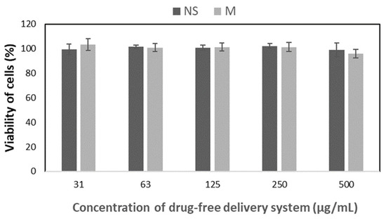 The cytocompatibility of the blank NS and M was studied according to the ISO 10993-5 standard with the use of the L-929 mouse fibroblast cell line (CCL-1, ™, American Type Culture Collection) []. The cytotoxic activity of native drugs, drug-loaded NS and drug-loaded M was studied against the human cervical carcinoma HeLa cell line (CCL-2™, American Type Culture Collection). L-929 and HeLa cells were cultured in Eagle’s Minimum Essential Medium (EMEM) supplemented with 100 U/mL of penicillin, 100 μg/mL of streptomycin and 10% fetal bovine serum. The experimental medium was additionally supplemented with 10 mM HEPES. The cells were maintained at 37 °C in a humidified atmosphere containing 5% CO2.