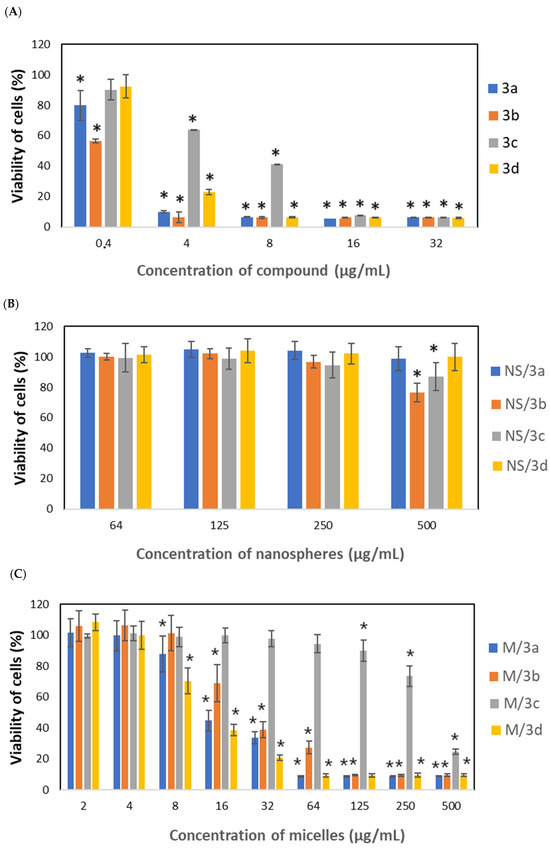 In the next step, a cytotoxicity study was conducted to evaluate the effect of the native drug, the drug encapsulated in NS and the drug encapsulated in M against cervical cancer cells (HeLa) (Figure 6). In line with expectations, the strongest effect was observed for the free-drug formulation, which caused a decrease in cell viability even at the lowest studied concentration (0.4 µg/mL), as observed in the case of 3a and 3b (Figure 6A). At concentrations equal to and greater than 4 µg/mL, all compounds showed a cytotoxic effect; however, the effect was less significant for 3c at 8 and 16 µg/mL.
