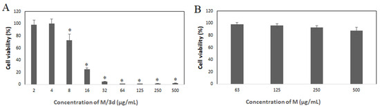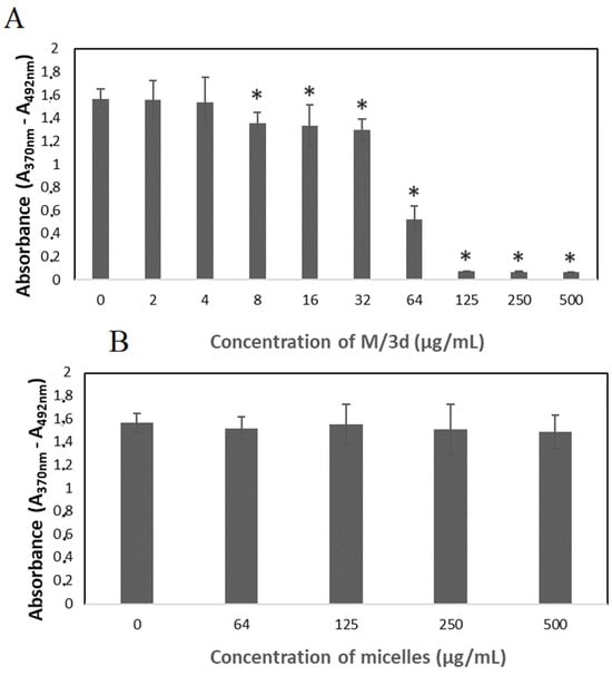A significantly stronger cytotoxic effect was observed for drug-loaded micelles (Figure 6C). Inhibition of cell growth in the presence of M/3a and M/3d was observed at a concentration range of 8–500 µg/mL and M/3b from 16 to 500 µg/mL. The lowest inhibitory effect was exhibited by M/3c (125–500 µg/mL).