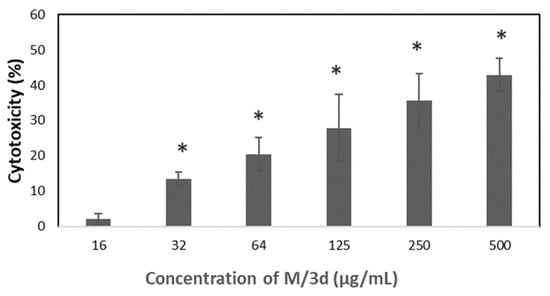 M/3d at a concentration equal to or greater than 32 µg/mL caused a significant increase in LDH release, as presented in Figure 8.