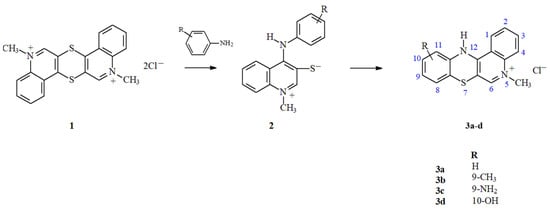 Phenothiazines are an interesting class of heterocyclic compounds possessing a tricyclic dibenzo-[1,4]-thiazine ring system with high therapeutic potential []. Phenothiazine derivatives may be even more effective in the treatment of anticancer diseases. An original method has been developed for the synthesis of azaphenothiazine derivatives that enables the formation of compounds containing specific substituents at different positions of the tetracyclic quinobenzothiazinium system []. Briefly, the method involves the reaction of thioquinanthrenediinium bis-chloride (1) with substituted isomeric anilines, which leads to the formation of a betaine system with the structure of 1-methyl-4-(phenylamino)quinoline-3-thiolate (2) as the intermediate product. As a result of its cyclization, a thiazine ring is formed (Scheme 1). Controlling the parameters of the cyclization reaction enables the introduction of various types of substituents in the 9, 10 and 11 positions of the quino[3,4-b][1,4]benzothiazine scaffold. Using this synthetic method, derivatives 3a–d, containing different types of substituents (CH3, NH2, OH) in the quinobenzothiazinium system, were obtained.