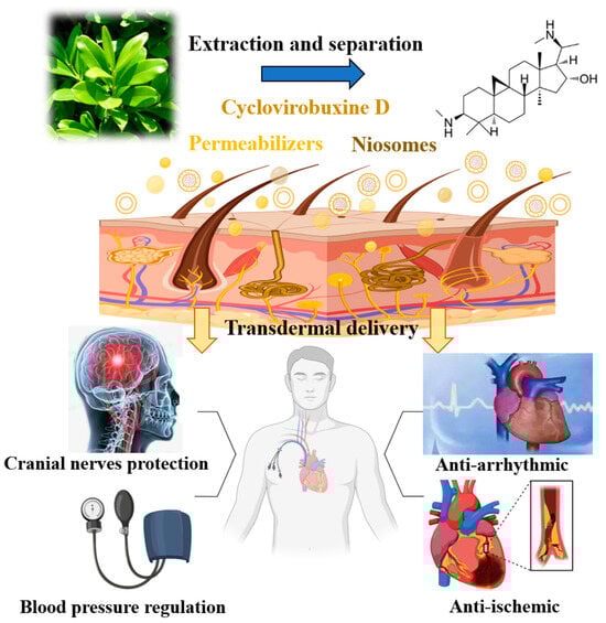 Cardiovascular and cerebrovascular diseases represent prevalent conditions among the elderly in our aging society and are characterized by their high incidence, severity, and mortality rates. The repertoire of safe therapeutic agents within this domain remains woefully inadequate. Notably, cyclovirobuxine D, an active natural compound derived from the medicinal plant Buxus sinica, holds immense clinical potential in treating these diseases. It demonstrates a broad spectrum of therapeutic activities, including addressing cerebrovascular disorders and neuropathies [1], but also exhibits remarkable therapeutic versatility in addressing chronic ailments such as cardiovascular and cerebrovascular diseases [2], correcting arrhythmias [3], modulating blood pressure, and treating ischemic heart failure [4], among others (Figure 1). This compound achieves these benefits by enhancing intracellular Ca2+ utilization, which alleviated cardiac dysfunction in rats with congestive heart failure [5], and significantly inhibited the progression of heart failure [6]. Conversely, it mitigated the influx of Ca2+ through L-type Ca2+ channels, modulated iron metabolism, and alleviated cardiac iron toxicity induced by sepsis [7]. Furthermore, cyclovirobuxine D demonstrated potential in treating diabetic cardiomyopathy (DCM) by inhibiting oxidative stress through the activation of the Nrf2 signaling pathway [4]. By concurrently activating Nrf2 and SIRT3, it improved aldosterone regulation [8] and protected against cardiomyopathy by mitigating oxidative damage and maintaining mitochondrial biogenesis [7]. Despite its promising therapeutic potential, the unique physicochemical properties of cyclovirobuxine D pose significant challenges. Its low solubility in water, chloroform, methanol, ethanol, and acetone (approximately 0.06 mg/mL in water) [9,10], combined with an oil–water partition coefficient of 2.4 [10], result in poor bioavailability. Traditional oral and injection routes exacerbate these issues due to the prominent first-pass effect and notable toxicity to the liver, kidney, and reproductive system. Moreover, the lack of innovative delivery systems for cyclovirobuxine D further restricts its clinical application. These limitations significantly hinder the utilization of cyclovirobuxine D in medical practices.