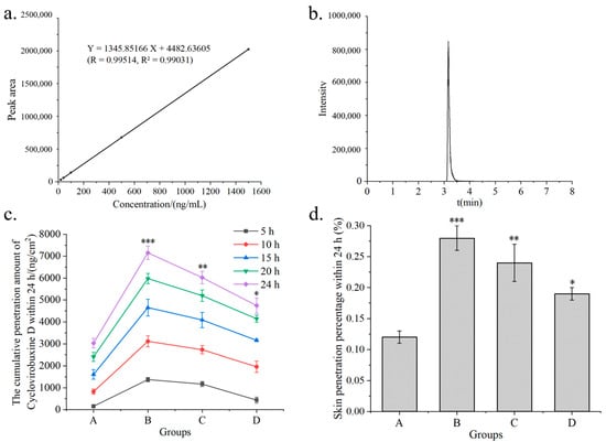 (a) standard curves obtained from different concentrations of cyclovirobuxine D samples by LC–MS; (b) peak time of cyclovirobuxine D samples under liquid quality conditions by LC–MS; (c) cumulative skin penetration and (d) cumulative skin penetration percentage (%) of cyclovirobuxine D under different receiving liquids A, B, C, and D. Among these, PEG400: ethanol: saline was selected as the receiving liquid, with volume ratios of 1:3:6, 2:2:6, and 2.5:2.5:5, respectively, represented by B, C, and D, where A is saline as the receiving liquid. * p < 0.05, ** p < 0.01, and *** p < 0.001.