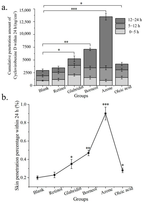 (a) cumulative skin penetration; and (b) skin penetration percentage (%) of cyclovirobuxine D under the condition of V (ethanol: saline) = 3:7 as the transdermal receiving liquid for different chemical penetration enhancers. * p < 0.05, ** p < 0.01, and *** p < 0.001.