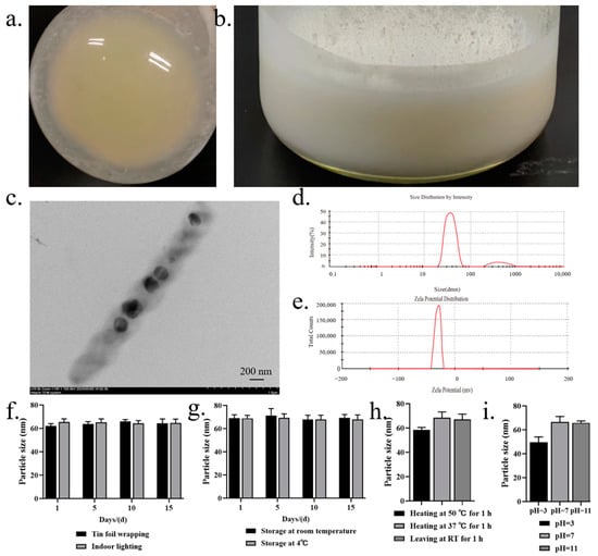 (a) pressure was reduced and evaporation was rotated at 40 °C until a yellow viscous solid film appeared at the bottom of the round bottomed flask; (b) after magnetic stirring for 1 h in a constant temperature environment of 55 °C, the white homogeneous liquid appears viscous; (c) Cy-Nio observed under a 15k transmission electron microscope; (d) particle size; and (e) potential distribution of niosomes. Evaluation of: (f) the photostability; (g) storage stability; (h) thermal stability; and (i) acid-base stability of Cy-Nio in the range of 1, 5, 10, and 15 d.