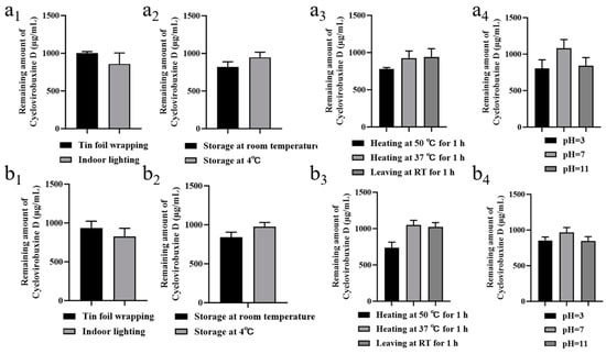(a1) photostability; (a2) storage stability; (a3) thermal stability; and (a4) acid-base stability of 1 mg/mL cyclovirobuxine D solution. (b1) Photostability; (b2) storage stability; (b3) thermal stability; and (b4) acid-base stability of 1 mg/mL Cy-Nio. Among these, the statistical time for photostability and storage stability was 10 d, and the statistical time for thermal stability and acid-base stability was 1 h.