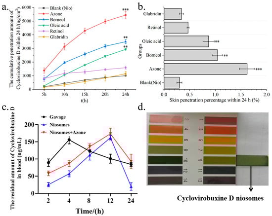 (a) Cumulative skin penetration; and (b) skin penetration percentage (%) of Cy-Nio under the condition of V (ethanol: saline) = 3:7 as the transdermal receiving liquid for different chemical penetration enhancers. (c) Pharmacokinetic curves of cyclovirobuxine D at different time points in the oral group, skin application group, and combination group of cyclovirobuxine D niosomes and azone. (d) The pH of cyclovirobuxine D niosome was detected using pH test strips. ** p < 0.01, and *** p < 0.001.