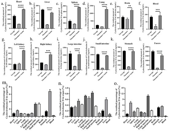 At 24 h after treatment with cyclovirobuxine D and Cy-Nio, the residual amount of cyclovirobuxine D in various organs of mice was detected, including: (a) heart; (b) liver; (c) spleen; (d) lungs; (e) brain; (f) blood; (g) left kidney; (h) right kidney; (i) large intestine; (j) small intestine; (k) stomach; (l) feces; and (m) oral method. (n) Cy-Nio; and (o) Cy-Nio were combined with azone to determine the percentage of residual cyclovirobuxine D in each organ. ** p < 0.01, *** p < 0.001, and **** p < 0.0001.