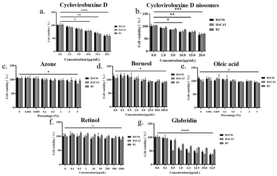 The effects of different concentrations of: (a) cyclovirobuxine D; (b) Cy-Nio; (c) azonel (d) borneol; (e) oleic acid; (f) retinol; and (g) glabridin on cell proliferation of RSC96, HACAT, and BJ cells. ns > 0.05, * p < 0.05, ** p < 0.01, *** p < 0.001, and **** p < 0.0001.