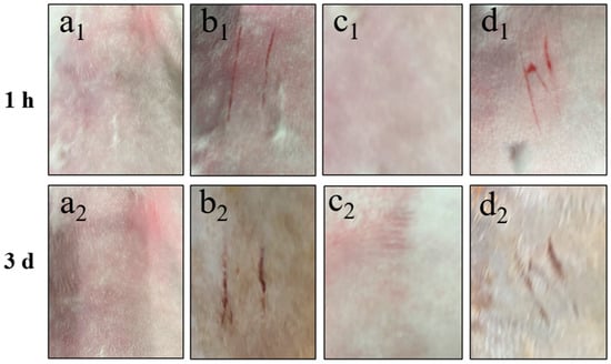 Skin irritation intensity of intact and scratched back skin of New Zealand white rabbit treated with Cy-Nio (contain azone) for 1 h and 3 d. Among them, (a1,a2) are the intact blank group skin, (b1,b1) are the scratched blank group skin, (c1,c2) are the intact Cy-Nio group skin, and (d1,d2) are the scratched Cy-Nio group skin.