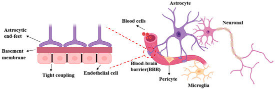 The BBB is a complex physiological structure, primarily comprising brain capillary endothelial cells, basement membranes, pericytes, and glial cells (e.g., astrocytes) [16]. Its physiological structure is illustrated in Figure 1. The primary function of the BBB is to safeguard the CNS from detrimental substances in the external environment, while maintaining the homeostasis of the intracerebral environment.