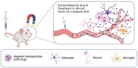 In addition to using ultrasound to facilitate the opening of BBBs, the inherent properties of magnetic nanoparticles (MNPs) can be harnessed to achieve a breakthrough in BBB-targeted neurological drug delivery, as illustrated in Figure 2. These particles, which are typically composed of polymers or metals, are capable of encapsulating the drug and targeting it to affected tissues via a magnetic field [67]. For instance, Kong and colleagues demonstrated that MNP can traverse normal BBBs using an external magnetic field in a mouse model. These MNPs are able to penetrate the BBB using an external magnetic field after systemic administration and accumulate in the perivascular region of the brain parenchyma [68]. Furthermore, penetrating peptides (e.g., angiopep-2 and Tat peptides) can bind to the MNPs, thereby enhancing their ability to across the BBB. These peptides are capable of binding to specific receptors on the BBB, thereby promoting the endocytosis of nanoparticles. The ability of MNPs to be manipulated in the presence of a magnetic field allows for their direction towards specific brain regions [69].