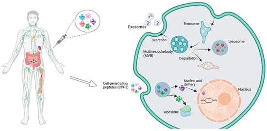 Schematic representation of the role of exosomes and cell-penetrating peptides in cells.