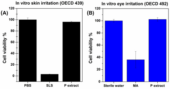 In vitro (A) skin and (B) eye irritation assays: cell viability % referred to control cells (treated with PBS or sterile water) after treatment with the positive control (SLS or MA) and the P extract (10% w/v solution in sterile water). The experiments were conducted in accordance with the OECD 439 and 492 guidelines by using a 3D human artificial skin model (EpiDermTM) or a 3D human corneal epithelium model (EpiOcularTM), respectively. Means (n = 3) ± SD (p < 0.05).