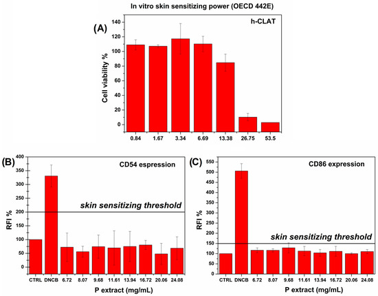 To assess the sensitizing power of the P extract, a composite in vitro test was performed in accordance with the OECD 442E. Firstly, the cytocompatibility range of concentration to be used for the further real test aimed at evaluating the skin sensitizing power was determined (Figure 3A). The sensitizing power was then assessed by evaluating the level of CD54 and CD86, which are known co-stimulatory molecules expressed during the process of skin sensitization due to immune response caused by antigen presentation [49]. In the graphs in Figure 3B,C, the threshold levels for CD54 and CD86, respectively, are highlighted.