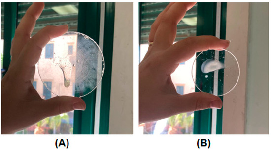 In vitro qualitative assay to verify the temperature-dependent gelation behavior of the buccal formulation when sprayed on a watch glass at (A) room temperature and (B) 37 ± 1 °C.