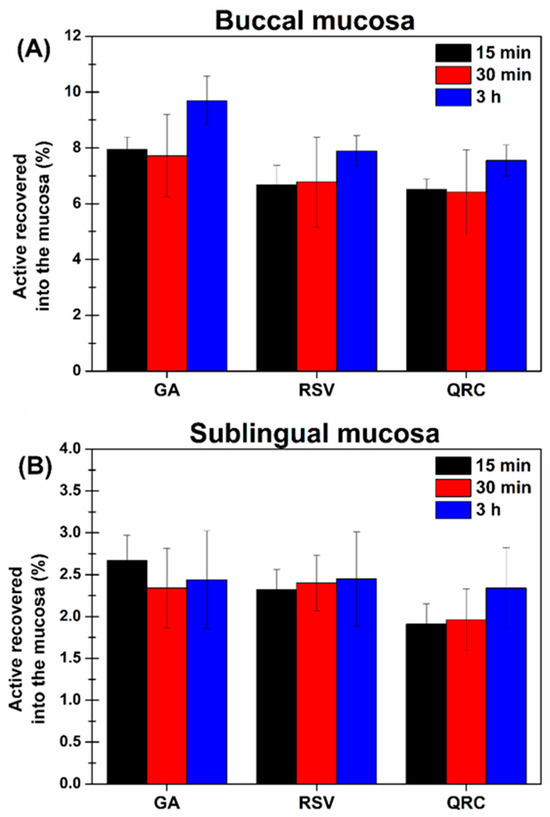 Percentage amount of GA, RSV, and QRC entrapped into the (A) buccal and (B) sublingual mucosae after different incubation times with the buccal in situ gelling formulation. Means (n = 6) ± SE (p < 0.05).