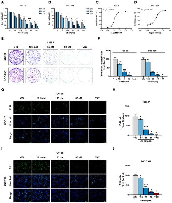 C118P inhibits cell proliferation in GC cell lines HGC-27 and SGC-7901. (A,B) Cell viability was determined with the MTT assay in HGC-27 (A) and SGC-7901 (B) cells treated with various concentrations (up to 100 nM) of C118P for 24 h, 48 h, and 72 h. (C,D) Cell proliferation curves of HGC-27 (C) and SGC-7901 (D) cells treated with various concentrations of C118P for 72 h were detected with the MTT assay. (E,F) Representative images (E) and summarized data (F) of the colony formation assay showing decreased cell density in GC cells treated with C118P (12.5, 25, 50 nM) for 7 days (HGC-27 cells) or 10 days (SGC-7901 cells). (G–J) The cell proliferation of HGC-27 (G,H) and SGC-7901 (I,J) cells treated with C118P (12.5, 25, 50 nM) for 24 h was tested with the EdU assay. Representative images (G,I) were photographed using an inverted fluorescence microscope and EdU ratios (H,J) were analyzed. Scale bar, 200 μm. Taxol (TAX, 50 nM) was used as the positive control. Data are represented as the mean ± SD of three independent experiments. * p < 0.05, ** p < 0.01, *** p < 0.001, # p < 0.0001 vs. control group.