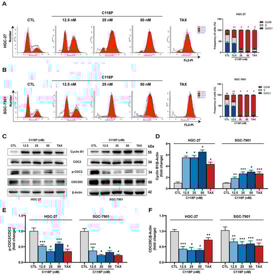 We next examined the effect of C118P on cell cycle distribution in GC cells using a flow cytometry assay (PI staining). Figure 2A,B show a significant increase in the proportion of HGC-27 and SGC-7901 cells in the G2/M phase following C118P treatment compared to that of controls, indicating that C118P induced cell cycle arrest in the G2/M phase. To clarify the mechanism of C118P on G2/M arrest, we assessed cell cycle checkpoints by detecting Cyclin B1, p-CDC2 (Tyr15), and CDC25C proteins using immunoblotting assays. Our data showed that the Cyclin B1 protein level increased while p-CDC2 (Tyr15) and CDC25C proteins’ level decreased in both HGC-27 and SGC-7901 cells after C118P treatment (Figure 2C–F). Thus, C118P induces G2/M-phase cell cycle arrest in GC cells through the CDC25C/Cyclin B1/CDC2 pathway.