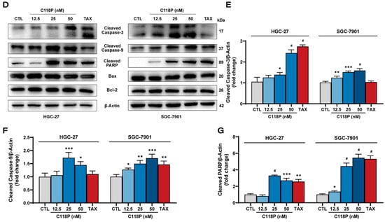 C118P induces apoptosis in GC cell lines HGC-27 and SGC-7901. (A) Representative images showing morphology changes in HGC-27 and SGC-7901 cells treated with C118P (12.5, 25, 50 nM) for 24 h. Scale bar, 200 μm. (B,C) Representative images (left panel) and summarized data (right panel) of the flow cytometry assay (Annexin V/PI) showing the apoptotic cells in HGC-27 (B) and SGC-7901 (C) cells treated with C118P (12.5, 25, 50 nM) for 24 h. (D) Representative immunoblotting images of Cleaved Caspase-3, Cleaved Caspase-9, Cleaved PARP, Bax, and Bcl-2 protein expression in HGC-27 and SGC-7901 cells treated with C118P (12.5, 25, 50 nM) for 24 h. (E–G) Summarized data of the immunoblotting assay showing increased protein expressions of Cleaved Caspase-3 (E), Cleaved Caspase-9 (F), and Cleaved PARP (G) in GC cell lines HGC-27 and SGC-7901 treated with C118P (12.5, 25, 50 nM) for 24 h. Taxol (TAX, 50 nM) was used as the positive control. Data are represented as the mean ± SD of three independent experiments. * p < 0.05, ** p < 0.01, *** p < 0.001, # p < 0.0001 vs. control group.