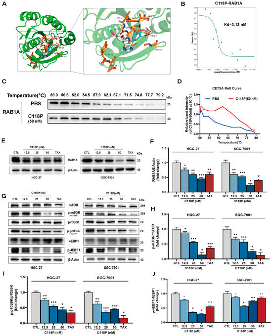 C118P inhibits the growth of GC cells via binding to RAB1A and inhibiting the RAB1A-mTOR axis. (A) Docked structure and interactions of C118P binding to RAB1A. (B) The representative dose–response curve of MST. (C,D) CETSA showing that C118P binds to RAB1A at the cellular level. A densitometry analysis of the bands from immunoblots was performed with ImageJ (Version 1.8.0.112) and normalized to that at 50 °C, respectively. (E,F) Representative immunoblotting images (E) and summarized data (F) showing a decreased protein level of RAB1A in GC cell lines HGC-27 and SGC-7901 treated with C118P (12.5, 25, 50 nM) for 24 h. (G) Representative immunoblotting images of protein expressions of mTOR, p-mTOR, p70S6K, p-p70S6K, 4EBP1, and p-4EBP1 in HGC-27 and SGC-7901 cells treated with C118P (12.5, 25, 50 nM) for 24 h. (H–J) Summarized data from the immunoblotting assay showing decreased protein expressions of p-mTOR (H), p-p70S6K (I), and p-4EBP1 (J) in HGC-27 and SGC-7901 cells treated with C118P (12.5, 25, 50 nM) for 24 h. Data are represented as the mean ± SD of three independent experiments. * p < 0.05, ** p < 0.01, *** p < 0.001, # p < 0.0001 vs. control group.