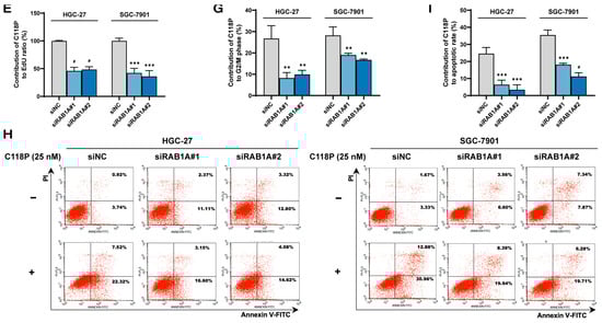 To further determine the contribution of RAB1A to the anti-GC effect of C118P, we detected the effect of C118P on malignant phenotypes in GC cells after RAB1A knockdown using short interfering RNA fragments of RAB1A (siRAB1A). Both siRAB1A#1 and siRAB1A#2 effectively reduced RAB1A mRNA and protein expression to near-undetectable levels in HGC-27 and SGC-7901 cell lines compared to the negative control (Figure 5A,B). RAB1A knockdown significantly inhibited cell proliferation, and induced apoptosis and cell cycle arrest in HGC-27 and SGC-7901 cells (Figure 5C,D,H and Figure S3A). Notably, RAB1A knockdown significantly mitigated C118P’s anti-proliferative effect, with a ~3-fold reduction in relative inhibition in colony formation assays (Figure 5C and Figure S3A). Similar results were observed in EdU staining assays (Figure 5D,E and Figure S3B). Furthermore, the G2/M arrest induced by C118P was also diminished in RAB1A-depleted cells (Figure 5F,G and Figure S3C). Additionally, the knockdown of RAB1A significantly decreased the pro-apoptotic effect of C118P in HGC-27 and SGC-7901 cells (Figure 5H,I and Figure S3D). Collectively, these results demonstrated that the anti-tumor activities of C118P against GC cells were attenuated following RAB1A knockdown, reflecting that C118P exerts its anti-tumor effects in GC cells via targeting RAB1A.