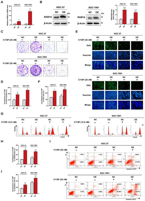 Effects of C118P on the growth of GC cell lines HGC-27 and SGC-7901 following RAB1A overexpression. (A) Summarized quantitative RT-PCR data showing an increased RAB1A mRNA level in HGC-27 and SGC-7901 cells transfected with a DNA–lipid complex expressing RAB1A (OE) vs. negative control (NC). (B) Representative immunoblotting images (left and middle panel) and summarized data (right panel) showing an increased protein level of RAB1A in HGC-27 and SGC-7901 cells transfected with a DNA–lipid complex expressing RAB1A (OE) compared to negative control (NC). (C,D) Representative images (C) of the colony formation assay showing cell density in GC cell lines HGC-27 (upper panel) and SGC-7901 (lower panel) treated with C118P (25 nM) after RAB1A overexpression and colony formation rates (D) were analyzed. (E,F) The cell proliferation of HGC-27 and SGC-7901 cells treated with C118P (25 nM) after RAB1A overexpression was tested by the EdU assay. Representative images (E) were photographed by an inverted fluorescence microscope and EdU ratios (F) were analyzed. Scale bar, 100 μm. (G,H) Representative images (G) and summarized data (H) of the flow cytometry assay showing the cell cycle distribution of HGC-27 and SGC-7901 cells treated with C118P (12.5 nM) after RAB1A overexpression. (I,J) Representative images (I) and summarized data (J) of the flow cytometry assay (Annexin V/PI) showing the apoptotic cells in HGC-27 and SGC-7901 cells treated with C118P (25 nM) after RAB1A overexpression. Data are represented as the mean ± SD of three independent experiments. ** p < 0.01, *** p < 0.001, # p < 0.0001 vs. negative control group.