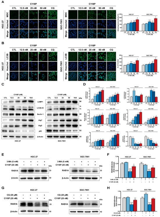 Effects of C118P on the autophagic–lysosomal degradation of RAB1A in GC cell lines HGC-27 and SGC-7901. (A) The eosinophilic vacuoles in HGC-27 (left panel) and SGC-7901 (middle panel) cells treated with C118P (12.5, 25, 50 nM) for 24 h were labeled by MDC, and autophagosome density (right panel) was analyzed. Scale bar, 40 μm. (B) The formation of autophagosomes in HGC-27 (left panel) and SGC-7901 (middle panel) cells treated with C118P (12.5, 25, 50 nM) for 24 h was detected by immunofluorescence staining of LC3B, and endogenous LC3B puncta per cell (right panel) were analyzed. CQ (20 μM) was used as the positive control. Scale bar, 40 μm. (C,D) Representative immunoblotting images (C) and summarized data (D) showing the protein expression of LAMP1, LC3B-I/II, Beclin 1, Atg7, Atg5, and p62 in HGC-27 and SGC-7901 cells treated with C118P (12.5, 25, 50 nM) for 24 h. (E,F) Representative immunoblotting images (E) and summarized data (F) showing the protein level of RAB1A in HGC-27 and SGC-7901 cells treated with 3-MA (5 mM) and C118P (25 nM) for 24 h. (G,H) Representative immunoblotting images (G) and summarized data (H) showing the protein level of RAB1A in HGC-27 and SGC-7901 cells treated with CQ (20 μM) and C118P (25 nM) for 24 h. Data are represented as the mean ± SD of three independent experiments. * p < 0.05, ** p < 0.01, *** p < 0.001, # p < 0.0001 vs. control group.