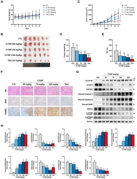 The anti-tumor effects of C118P against gastric cancer were validated in vivo using an SGC-7901 xenograft mouse model. Firstly, we did not observe significant toxicity of C118P, reflected in unchanged body weight at all three concentrations compared to the control (Figure 8A). Remarkably, C118P (50, 75, or 100 mg/kg) or Taxol (15 mg/kg) administration attenuated tumor growth in tumor-bearing nude mice compared to the controls (Figure 8B). The overall size and weight of tumors in the C118P-treated groups were significantly lower than those in the negative control group (Figure 8C,D). Figure 8E of the analysis of tumor volume revealed relative tumor proliferation rates (T/C%) of 52.10%, 42.84%, and 42.37% in mice treated with C118P at 50, 75, and 100 mg/kg, respectively, and 25.10% inhibition in mice treated with Taxol (15 mg/kg) (Figure 8E). The effects of C118P on GC cell proliferation and apoptosis in vivo were confirmed through HE staining and immunohistochemical staining detecting Ki67- and TUNEL-positive cells. As shown in Figure 8F, Ki67 expression was markedly reduced in C118P-treated tumors compared to that of negative controls, indicating that C118P suppresses the tumor proliferation in vivo. Meanwhile, the TUNEL staining results showed that C118P dramatically increased the proportion of TUNEL-positive cells in tumor tissues, indicating the pro-apoptosis effect of C118P in vivo. Indeed, the results of immunoblotting further confirmed that C118P inhibited GC tumor growth in vivo via G2/M cell cycle arrest and apoptosis, which is consistent with the in vitro results as shown in Figure 2C–F and Figure 3D–G.