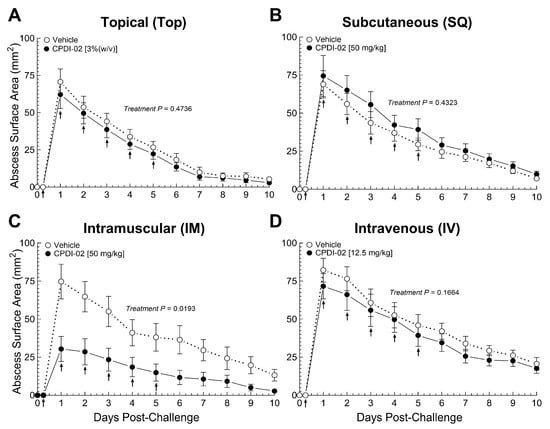 To establish that CPDI-02 increases curative protection against subcutaneous infection with CA-MRSA, we (i) injected CA-MRSA USA300 LAC subcutaneously into the rear dorsal side of healthy female outbred CD-1 mice [], (ii) administered vehicle alone or vehicle containing CPDI-02 (Table 1) at the indicated dose by a topical (TOP), subcutaneous (SQ), intramuscular (IM), or intravenous (IV) route at 6 h post-challenge, then daily over 5 days post-challenge (6 treatments total), and (iii) compared surface areas of subcutaneous abscesses (Figure S1) daily over 10 days post-challenge by quantitative image analysis (Figure 1).