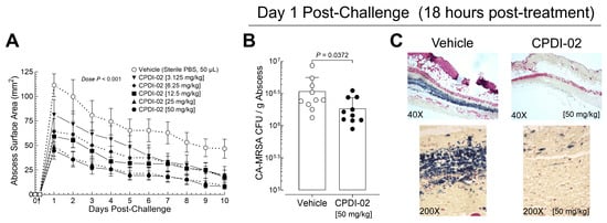 Single early-stage IM treatment with CPDI-02 (Figure 2A, black symbols) decreased maximum abscess surface area (Day 1 post-challenge) and time to resolution (Day 10 post-challenge) vs. vehicle alone (Figure 2A, white circles) as the dose of CPDI-02 increased with an ED50 of ~4 mg CDPI-02/kg. Single early-stage IM treatment with CPDI-02 at 50 mg/kg (Figure 2A, black circles) also decreased maximum abscess surface area (60% vs. 59% decrease on Day 1 post-challenge) and time to resolution to a similar extent as repeated early-stage IM treatment at the same dose (Figure 1C, black circles), despite the 50% larger maximum abscess surface areas in vehicle-treated mice vs. repeated IM treatment (Figure 2A vs. Figure 1C, black circles, Day 1 post-challenge) [111 ± 37 (SD) vs. 74 ± 36 mm2, p = 0.0433]. Single early-stage IM treatment with 50 mg CPDI-02/kg also decreased CA-MRSA CFU/g of abscess tissue on Day 1 post-challenge (Figure 2B, CPDI-02) by 1.9-fold vs. vehicle alone (Figure 2B, Vehicle) [1.8 × 106 ± 0.8 × 106 (SD) vs. 3 × 106 ± 2 × 106 CFU/g of abscess tissue] and qualitatively decreased detectable CA-MRSA in subcutaneous abscesses (Figure 2C, CPDI-02 vs. vehicle). Thus, single early-stage treatment with CPDI-02 by the IM route is sufficient to increase curative protection against subcutaneous infection with CA-MRSA in a dose-dependent manner under these experimental conditions.
