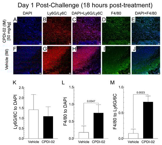 Single early-stage IM treatment with CPDI-02 (Figure 3B,C) or vehicle alone (Figure 3G,H) had similar ratios of NPs (Ly6G/Ly6C+) to total cells (DAPI+) in subcutaneous abscesses (Figure 3K). In contrast, CPDI-02 (Figure 3D,E) increased ratios of MPs (F4/80+) to total cells (DAPI+) by 4-fold (Figure 3L) and mononuclear phagocytes to neutrophils (Ly6G/Ly6C+) by 7-fold (Figure 3M) vs. vehicle alone (Figure 3I,J). Thus, single early-stage IM treatment with CPDI-02 increases MPs in subcutaneous abscesses at an early stage of subcutaneous infection with CA-MRSA under these experimental conditions.