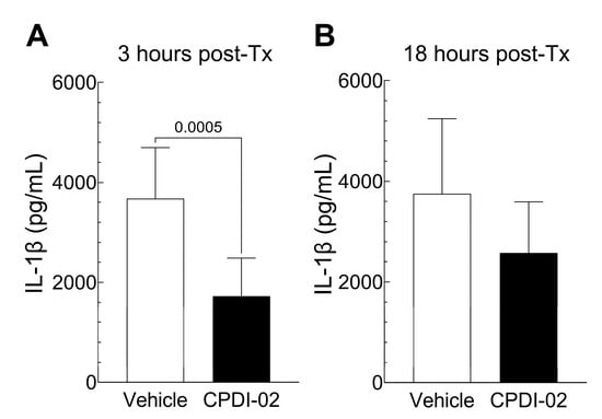 Single IM treatment with CPDI-02 at 6 h post-challenge decreased levels of IL-1β in subcutaneous abscesses at 3 h post-treatment (Figure 4A, black bar), but not 18 h post-treatment (Figure 4B, black bar), vs. vehicle alone (Figure 4, white bars) and had no effect on levels of IFN-γ, IL-2, IL-4, IL-5, IL-6, IL-10, IL-12p70, CXCL-1 [KC/GRO], or TNF-α at either time point (Figure S3). Thus, single early-stage IM treatment with CPDI-02 decreases early levels of IL-1β in subcutaneous abscesses after subcutaneous infection with CA-MRSA, but not most other cytokines/chemokines potentially involved in the inflammation of subcutaneous abscesses under these experimental conditions.