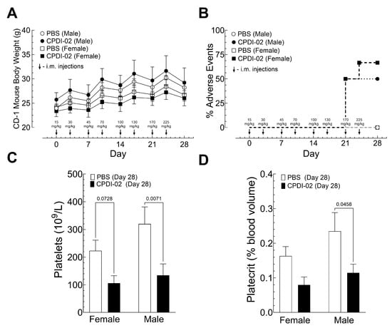 Four days after the final dose (225 mg/kg) (Day 28), IM dose escalation with CPDI-02 decreased platelets in male and female mice (Figure 6C, black bars), decreased platecrit in male mice (Figure 6D, black bars) vs. vehicle alone (Figure 6C,D, white bars), and increased signs of inflammation in 83% of female mice and 50% of male mice (Figure S4B, black bars), whereas vehicle alone increased signs of inflammation around the injection site in 17% of female mice but not in male mice (Figure S4B, black bars). IM dose escalation with CPDI-02 or vehicle alone, however, did not increase signs of inflammation in the thymus, heart, lungs, brain, liver, spleen, kidneys, femur bone marrow, popliteal lymph nodes, or Peyer’s patches in male or female mice. Thus, IM administration of CPDI-02 is tolerated by healthy male and female outbred mice to somewhere between 130 and 170 mg CPDI-02/kg, with males likely tolerating a higher dose than females.
