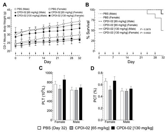 Repeat IM dosing of vehicle alone (Figure 7A, white circles [males] and squares [females]) or vehicle containing 65 mg CPDI-02/kg (Figure 7A, black circles [males] and squares [females]) or 130 mg CPDI-02/kg (Figure 7A, black circles [males] and squares [females]) over 32 days had no effect on weight gain by healthy male or female outbred mice. Unlike dose escalation to 225 mg CPDI-02/kg (Figure 6B), repeat dosing with CPDI-02 did not increase signs of distress up to 2 h after injection or affect CBC (Table S3), including platelets (Figure 7C, gray and black bars) or platecrit (Figure 7D, gray and black bars), or blood chemistry (Table S4) in male or female outbred mice vs. vehicle alone (Figure 7C,D, white bars) up to 4 days after the final injection (Day 32). Repeat IM dosing with 130 mg CPDI-02/kg, however, increased mortality in female mice after the eighth and ninth IM injection (p = 0.0022) (Figure 7, gray line) but not in male mice (Figure 7, black line) (p = 0.3679) vs. vehicle alone. Repeat IM dosing with CPDI-02 also increased signs of mild to severe inflammation around the injection site compared to vehicle alone (Figure S5B, gray and black bars) in a dose-dependent manner and in a greater proportion of female mice than male mice at both 65 mg/kg and 130 mg/kg (Figure S5B, gray and black bars). There were, however, no signs of inflammation in the thymus, heart, lungs, brain, liver, spleen, kidneys, femur bone marrow, popliteal lymph nodes, or Peyer’s patches. Thus, repeat IM treatment with CPDI-02 is tolerated by healthy male and female outbred mice to somewhere between 65 and 130 mg CPDI-02/kg, with males likely tolerating a higher repeat dose than females.