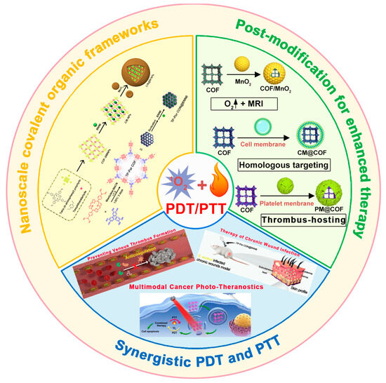 This review summarizes recent advancements in the application of porphyrin-based COFs for the combined photodynamic and photothermal therapy of malignant tumors and venous thrombosis and for antibacterial treatment and wound healing. As a class of purely organic crosslinked polymers, COFs offer excellent biocompatibility [78,79,80]. The periodic and ordered arrangement of porphyrin molecules within the COF framework provides an effective carrier strategy for the targeted delivery of hydrophobic porphyrin molecules to lesion sites [52]. This review encapsulates the design concepts and the photophysical and photochemical advantages of systems that utilize dual light sources for combined PDT and PTT. Additionally, it discusses the synergistic mechanisms when PTT and PDT are simultaneously activated by a single light source, offering crucial insights for the biomedical application of porphyrin-based COF nanoplatforms.