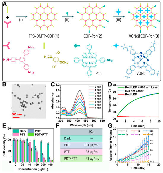 (A) Synthesis steps of VONc@COF-Por. (B) TEM images of VONc@COF-Por NPs. (C) 1O2 generation ability of VONc@COF-Por detected by DPBF under irradiation of a red LED. (D) Temperature changes in the solutions of VONc@COF-Por under red LED irradiation and/or NIR laser irradiation (808 nm). (E) Cell viabilities of various groups under different treatments. (F) IC50 of VONc@COF-Por under different treatments. (G) Relative tumor weight changes in different groups with different treatments. (i) Control, (ii) Laser, (iii) Dark, (iv) PDT, (v) PTT, (vi) PDT + PTT. (ns: no significant difference, * p < 0.05, *** p < 0.001) Reproduced with permission from [46]. Copyright (2019), American Chemical Society.