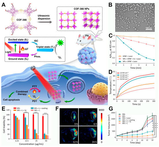 (A) Preparation of COF-366 NPs for PAI-guided phototherapy. (B) Scanning electron microscopy image of COF-366 nanoparticles. (C) 1O2 generation ability of COF-366 NPs after different treatments (Vc was used as the ROS scavenger). (D) Temperature changes in the solution of COF-366 NPs under 635 nm laser irradiation with various power densities. (E) Cytotoxicity of COF-366 NPs after different treatments. (F) Photoacoustic images of the tumor following intravenous injection at various time points. (G) Tumor volume changes after different treatments. (*** p < 0.001) Reproduced with permission from [42]. Copyright (2019), Elsevier.