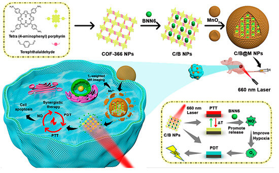 Although a single light source can activate porphyrin-based COFs for combined PDT and PTT, the hypoxic microenvironment still limits the efficacy of PDT. Therefore, employing strategies that generate oxygen can significantly mitigate the limitations imposed by hypoxia on PDT. A common approach is to use Pt NPs [57,58,59] or MnO2 [60,61,62,63] to catalyze the excess hydrogen peroxide within cancer cells to produce oxygen. In addition, the delivery of high concentrations of NO donor materials via carriers can also alleviate the inhibition of PDT by hypoxia [45]. High concentrations of NO not only interact with reactive oxygen species (ROS) to induce oxidative stress or nitrosative stress, ultimately leading to DNA damage and apoptosis in cancer cells, but also indirectly suppress the expression of HIF-1α and normalize the tumor vasculature, thereby reducing the impact of the hypoxic microenvironment on aerobic PDT [64,65,66]. Therefore, the integration of NO donors with PDT is a promising research direction [67,68,69]. The porous nature of COFs makes them a suitable carrier for NO donors. Based on this, Zhou et al. synthesized COF NPs using tetra-aminoporphyrin and terephthalaldehyde and then utilized the π–π stacking interactions of the COF’s conjugated structure to load the NO donor molecule N,N′-di-substituted butyl-N,N′-dinitro-1,4-phenylenediamine (BNN6), resulting in C/B NPs [45]. BNN6 has some degree of photothermal responsiveness. The authors then coated the C/B NPs with a layer of MnO2 to create a multifunctional combination therapy nanoplatform, C/B@M NPs (Figure 5). Under the weakly acidic conditions inside cancer cells, the MnO2 shell would be degraded, releasing BNN6. The photothermal effect generated by the porphyrin-based COFs under laser irradiation would then prompt BNN6 to release NO. In acidic conditions, the released Mn2+ ions can serve as a contrast agent for magnetic resonance imaging (MRI), which can guide the accumulation of the nanoplatform at the tumor site and determine the optimal timing for administration. Additionally, MnO2 can catalyze the decomposition of excess hydrogen peroxide within cancer cells to produce oxygen, thereby alleviating the hypoxic microenvironment that limits PDT. Consequently, under 660 nm laser irradiation, this system can achieve the triple-combined therapy of MRI-guided PDT, PTT, and NO-mediated gas therapy. This system takes advantage of the COF’s inherent porous structure to incorporate NO donors and the ease of surface modification to coat with MnO2, a catalyst that generates oxygen from hydrogen peroxide. The MnO2 coating serves to prevent premature singlet oxygen generation by the porphyrin-based COFs under natural light, avoiding damage to normal tissue, and to prevent the early release of NO, ensuring that NO is only released at therapeutic concentrations. Low concentrations of NO not only fail to kill cancer cells but may also promote their metastasis and proliferation. The perfect design of this system, from structure to function, provides a new concept for the enhancement of the combined PDT and PTT treatment of porphyrin-based COFs under light irradiation.