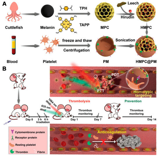 (A) Diagrammatic representation of the preparation method and (B) the mechanism of thrombolysis and prevention by HMPC@PM nanoparticles. Reproduced with permission from [44]. Copyright (2022), John Wiley & Sons, Ltd.